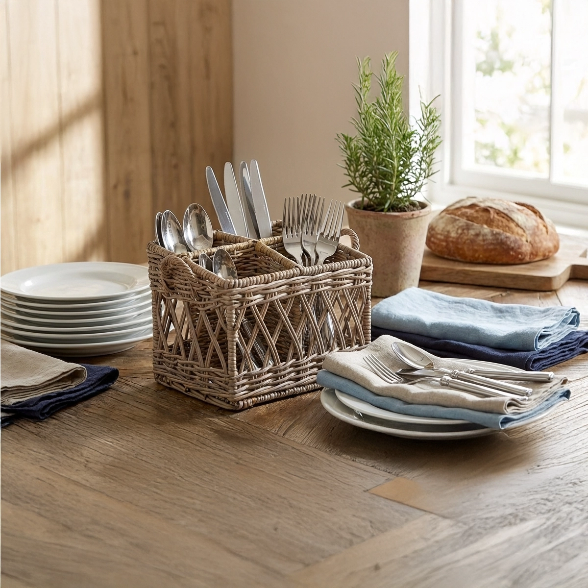 Durch die 4 Fächer lässt sich Besteck übersichtlich sortieren – Messer, Gabeln, Löffel oder auch Servietten sind sofort griffbereit. Damit eignet sich der Korb nicht nur für den Esstisch, sondern auch für Buffets, die Terrasse oder den Garten. Außerdem sorgen die stabilen Griffe dafür, dass du ihn bequem von der Küche zum Tisch tragen kannst.